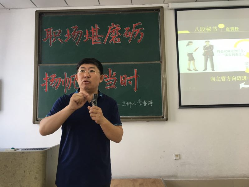 2017年6月20日下午13:30,中国石油天然气集团公司“十一五”优秀兼职培训教师,大庆油田优秀培训师,大庆油田化工有限公司轻烃分馏分公司党委副书记、纪委书记、工会主席李春海为2015级秘书学专业同学进行了一场生动形象的题为“职场堪磨砺,扬帆正当时”的讲座。