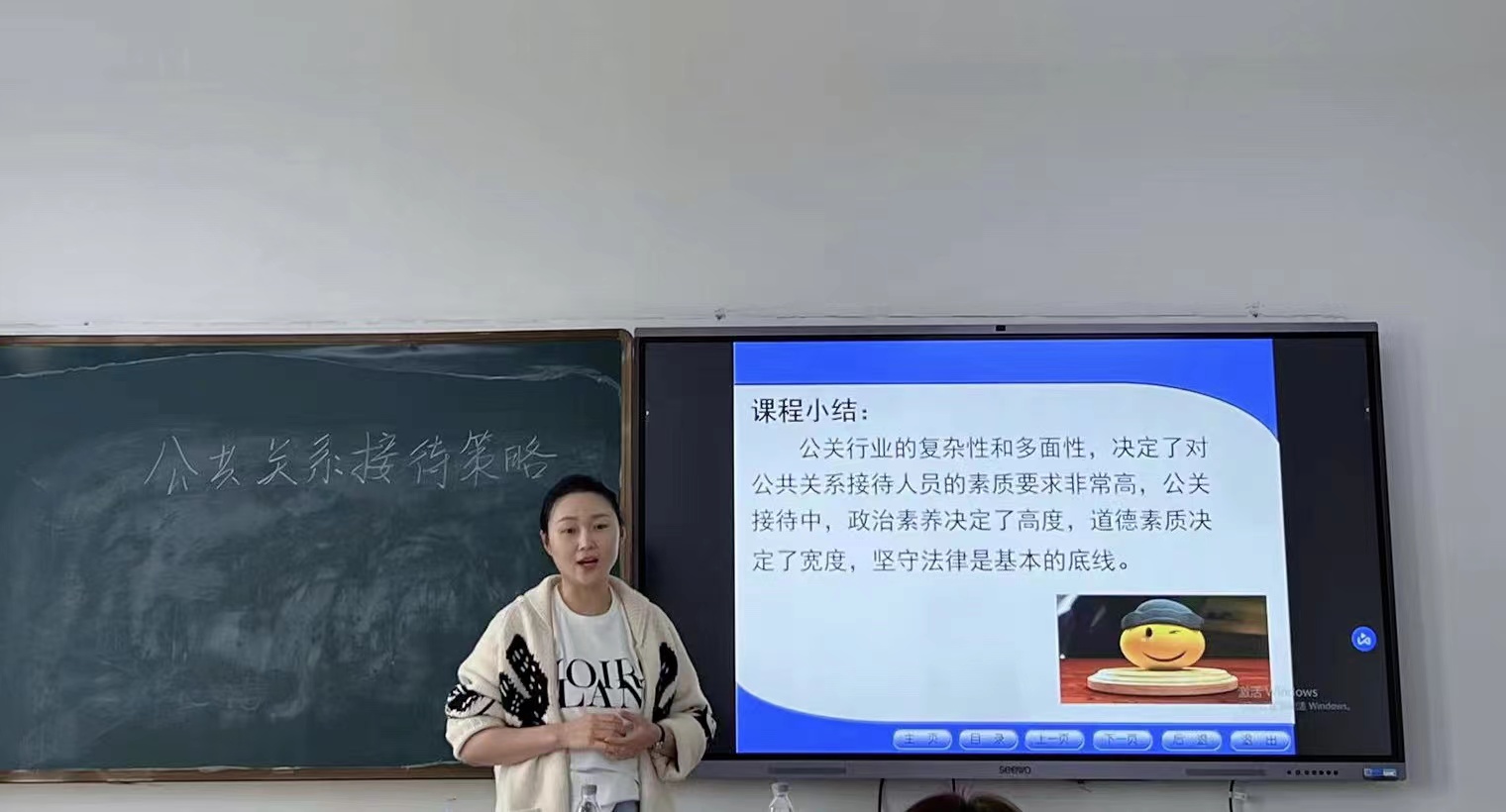 最后总结本次课程,根据公众在接待过程的特别需要,为了提高工作效率和效果,应该强化接待工作的策略意识。并且留下思考问题:送人玫瑰,手留余香。请您发自内心的赞美自己最喜欢的同学,然后观察这位同学的反应,从中感悟赞美的价值和要求,为这门课画上了一个完美的句号。