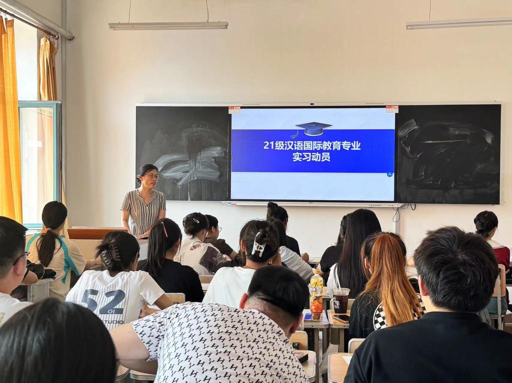 2024年7月8日,汉语国际教育系召开实习动员大会。会上,汉语国际教育系主任张立丹老师为即将踏上实习征途的2021级员工细致描绘了实习的多元蓝图,点亮了他们的职业探索之路。张老师不仅详尽阐述了各类实习岗位的特色、核心职责及所需技能,帮助员工精准定位个人兴趣与职业发展方向,还通过生动案例分享,让实习的轮廓在员工心中更加鲜明立体。