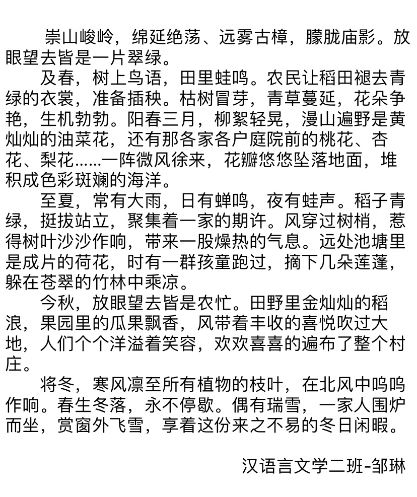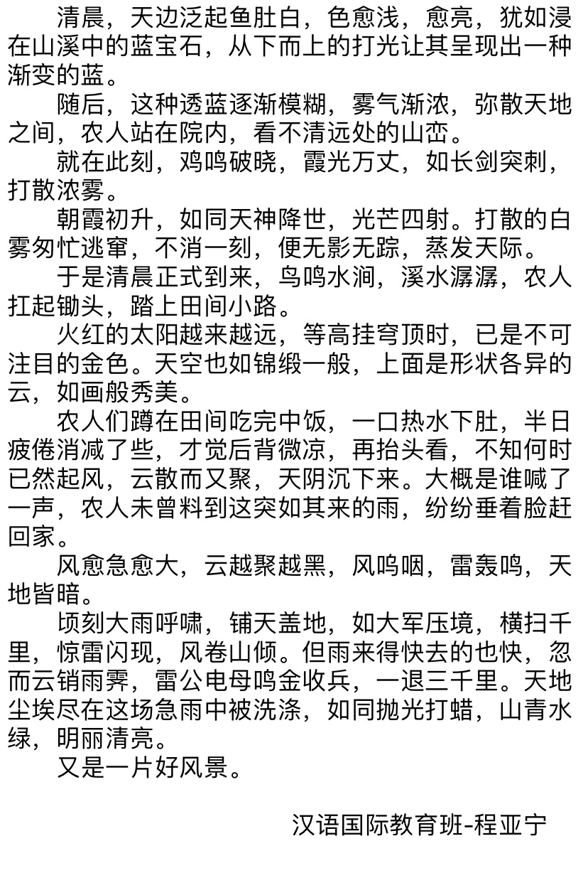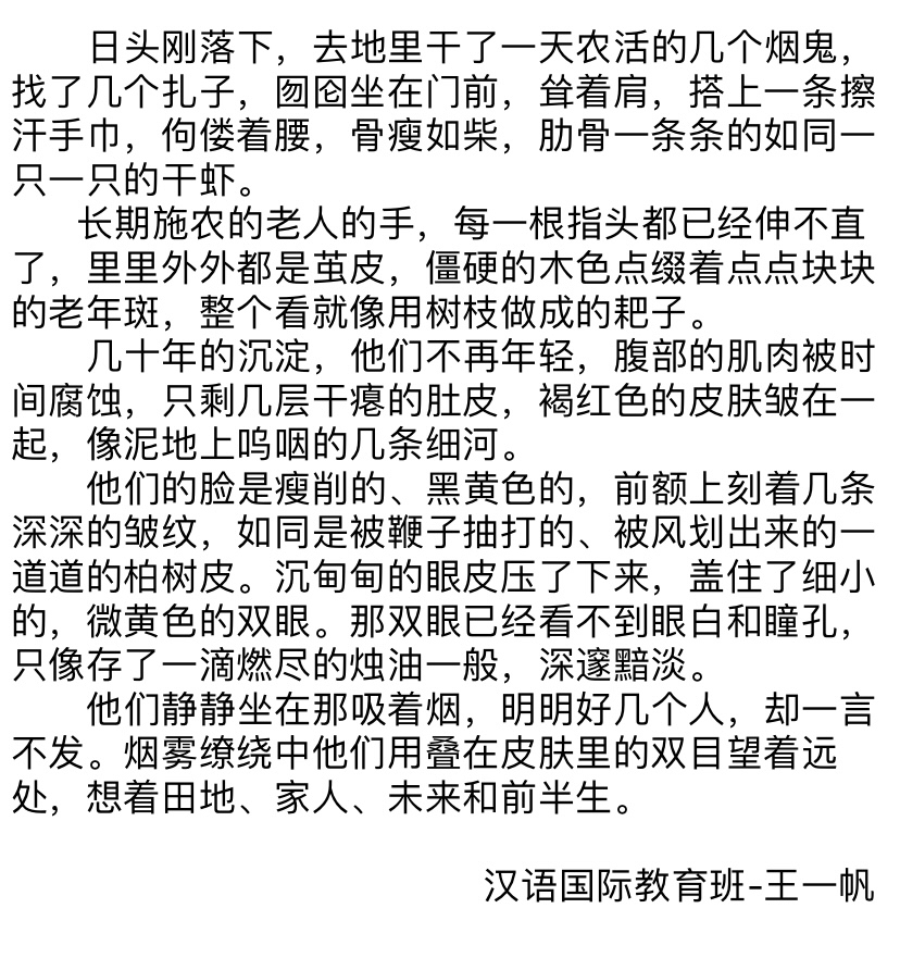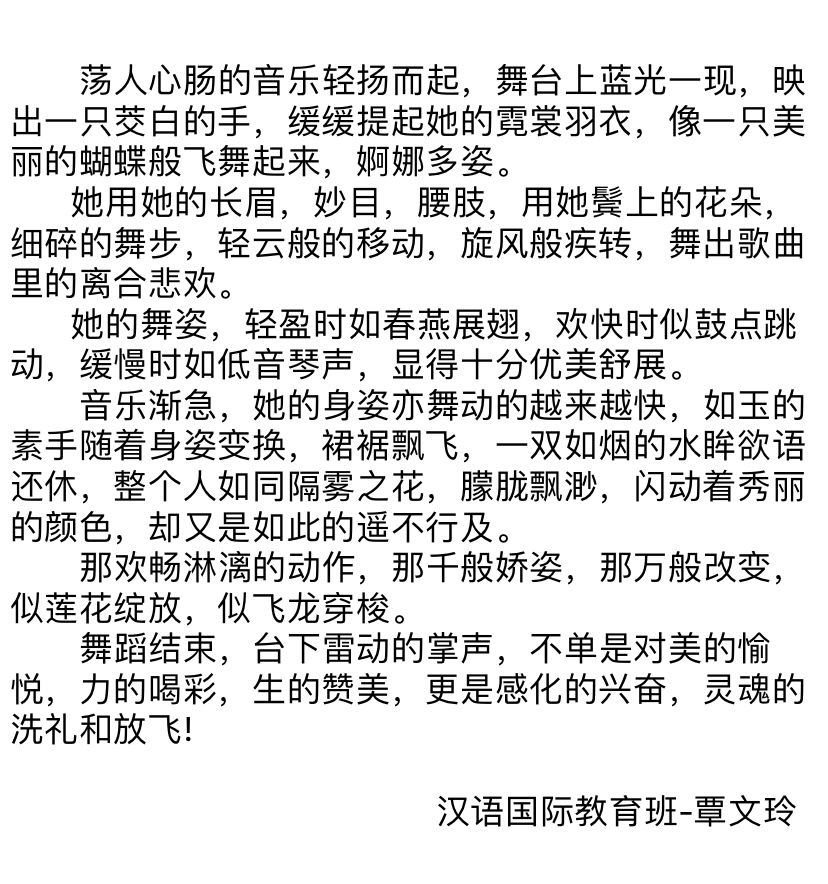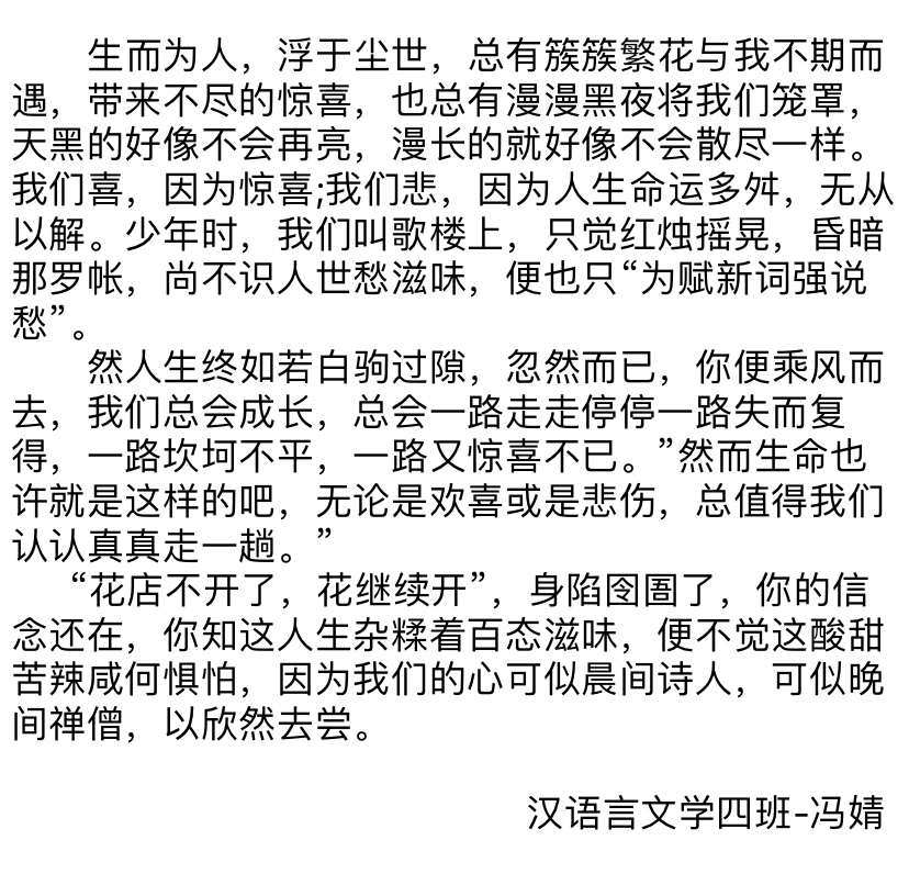 写作是一种能力,在于如何更好地描绘自身的精神世界,让它穿越浮云幻霭,掠过浪尖风口,俯瞰落花流水,万物尽收眼底后跃然纸上,成为一种特别的磁场。写作的魅力,就是串联读者与笔者内心深处的一座桥,它不在意谁写的更长,谁写的时间更久,谁的词藻更丰富,它是每个人的另一面镜子,是一种足以引起共鸣的情感,丝丝缕缕深入人心,历经朵朵火焰后亦能生生不息。本次写作训练,大家都有了自己的收获,优秀作品仅仅属于一种展示,相信更重要的成果自然会存在每位同学的心中。
