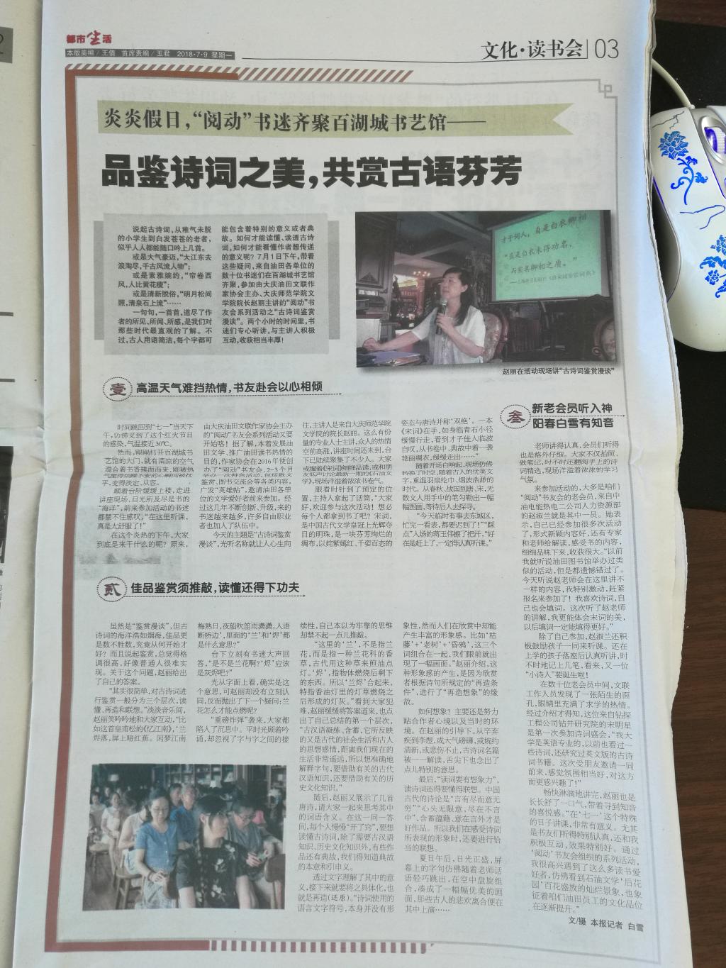 “阅动”书友会系列活动是自2016年起,由大庆油田作家协会创办的特色活动,主要包括散文鉴赏、图书交流等各类内容。本次讲座是大庆油田作家协会推出的一次重要活动,讲座中,赵丽教授以《忆江南》等大量古典诗词为例,深入浅出地讲解了古典诗词的鉴赏方法,并着重就诗词鉴赏过程中“读懂”、“再造”和“联想”三个鉴赏层次这一问题进行了诠释。参会者随着赵教授的讲解,品味着从李煜到辛弃疾等古代文豪的绝美之作,也尝试着体会这些古典诗词中的含蓄蕴藉。两小时的讲座中,黄发垂髫,共赏佳音。