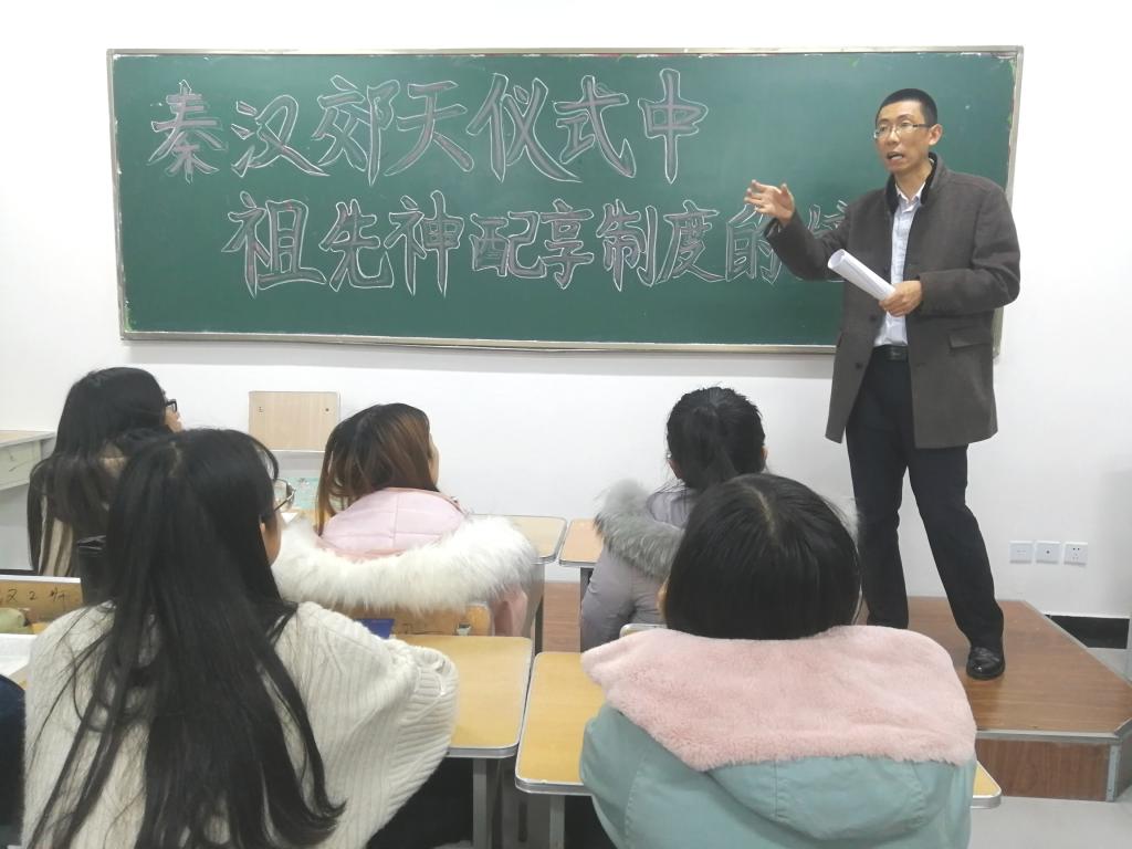 此次讲座,原昊老师主要讲述的祖先神配享制度,是经过春秋战国时期国家祭祀领域的激变,秦汉以后郊天仪式存在纷繁的情况下,传承下来“王者必以其祖配”的传统。郊祀作为典型的农事祭祀活动,在郊祀中所祭神祇具有典范意义的农业神性,历代郊祀仪式都蕴含着极其浓厚的农事意蕴。原昊老师根据多年的教学与研究经验对秦代“畤郊上帝”仪式中的农业神祇,汉代郊祀传统的复兴进行了阐释。在讲述秦朝时,他借用董仲舒的《春秋繁露》和《史记·秦本纪》,向同学们介绍了秦人对原始祭天仪式的承袭和创制。在这一问题上,原昊老师指出这种已成定势的农业思维模式,将国家祀典中的农业文明内核传承有序,这也透露出了秦人对畤祀的农事期许。
