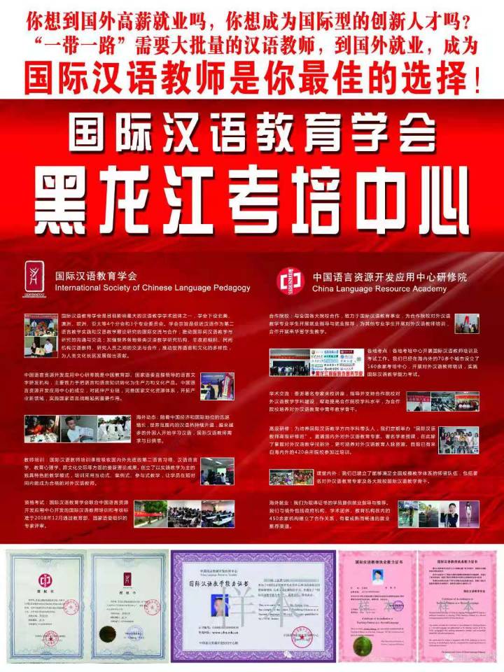 为适应“一带一路”沿线各国学汉语的需要,培养合格的国际汉语教师。自2016年开始,黑龙江国际旅游商务公司与中国语言资源开发应用中心研修院(该研修院是国家语委的业务部门),国际汉语教育学会合作开办国际汉语教团队格考前培训班。时间短、费用低、经考试合格可获国际汉语教育学会颁发的《国际汉语教师执业能力证书》和中国语言资源应用中心颁发的《国际汉语教学能力证书》,这两个证书具有合法性、权威性、实用性,国际承认,终身受益。