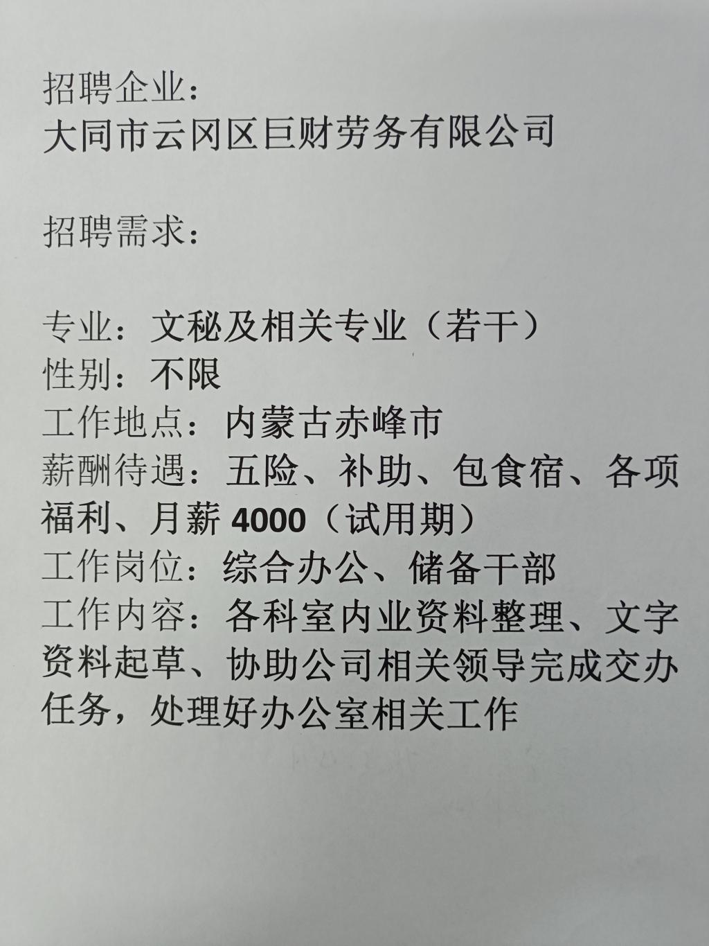 大同市云冈区巨财劳务有限公司2023年招聘信息