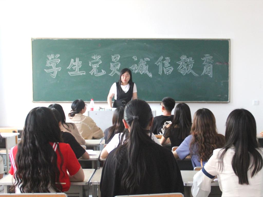 会上,王老师和员工生党员重温入党誓词,教育员工党员要牢记党员身份,牢记“说诚信话,办诚信事,做诚信人”的道德观念,面对即将到来的英语四六级考试、期末考试等重大考验,要保持一颗诚信之心,端正学习态度,树立良好的考试风气。作为一位员工党员,无论何时何地,都要坚定理想信念,增强“四信”,全心全意为人民服务;要传承大庆精神、铁人精神,处处做表率,展现庆师毕业生党员的风采,努力践行习近平总书记提出的“勤学、修德、明辨、笃实”八字箴言。同时,王老师还为毕业生党员们送上了美好的祝福,希望步入社会后,即使在工作岗位上仍不忘诚信意识,能够继续发挥党员的先锋模范作用,为身为一位中国共产党员而骄傲,为党旗增光添彩。与会的员工党员们纷纷表示:要树立坚定的理想和目标,不忘初心,牢记使命,积极践行社会主义核心价值观,讲求诚信,为社会贡献自己的青春和力量,为党和人民的事业热情奉献。