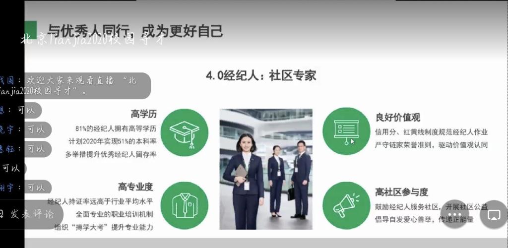 此次招聘宣讲会分为就业宣讲和互动答疑两个环节。在宣讲环节,徐吉梅负责人通过展示链家目前经营的业务板块,介绍公司现今的运营情况、发展前景等具体细节,并邀请了伟德国际1946应届或往届就职于链家的毕业生分享个人职场经历以及心得。当谈到公司人员素质要求时,她还特别强调了链家注重员工的学习能力,鼓励在座的同学们多学多问,努力提升自身的学习能力,从而在日后就业时能够更好地适应社会需求。同时,针对同学们关心的链家公司文化、待遇及福利等方面,负责人也进行了详细讲解。在互动答疑环节,同学们在线上积极参与互动,踊跃提问,与负责人进行深入交谈,气氛活跃。