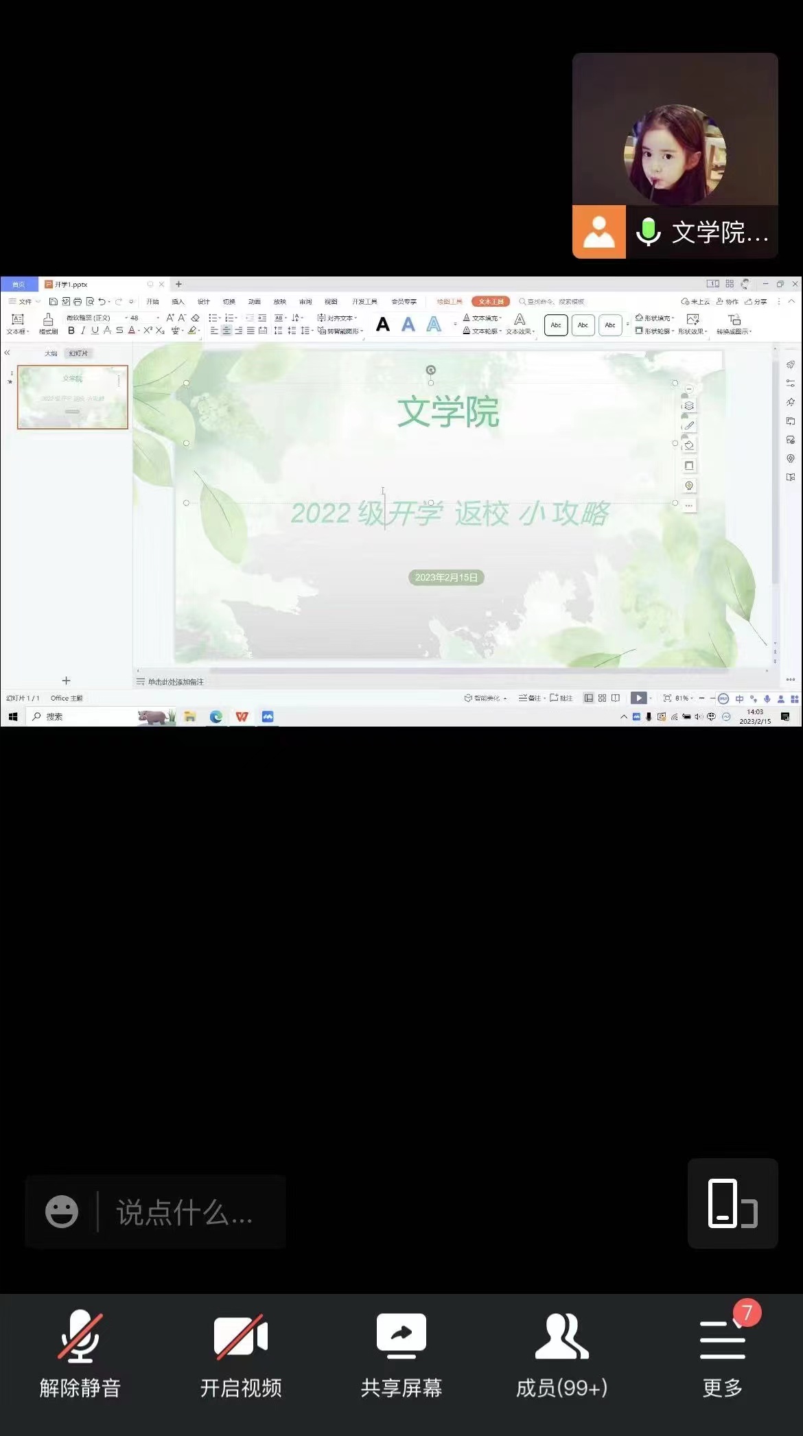 2022级员工没有入校学习生活经验,辅导员谢兆雪老师在线上会议中,耐心细致的解答了同学们的提问,把入校流程要点、寝室注意事项等事项,编写成“返校小攻略”,分享给同学们。