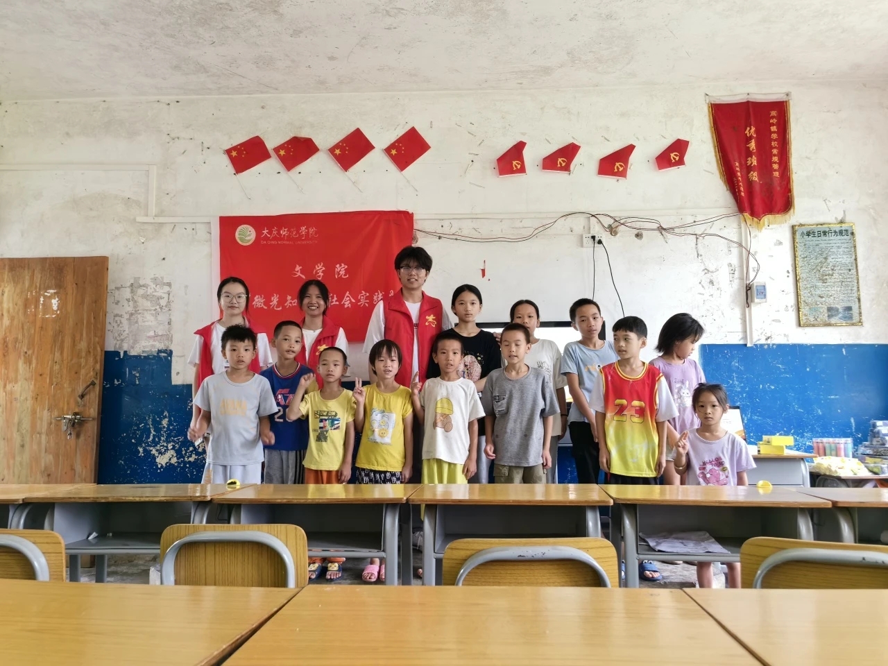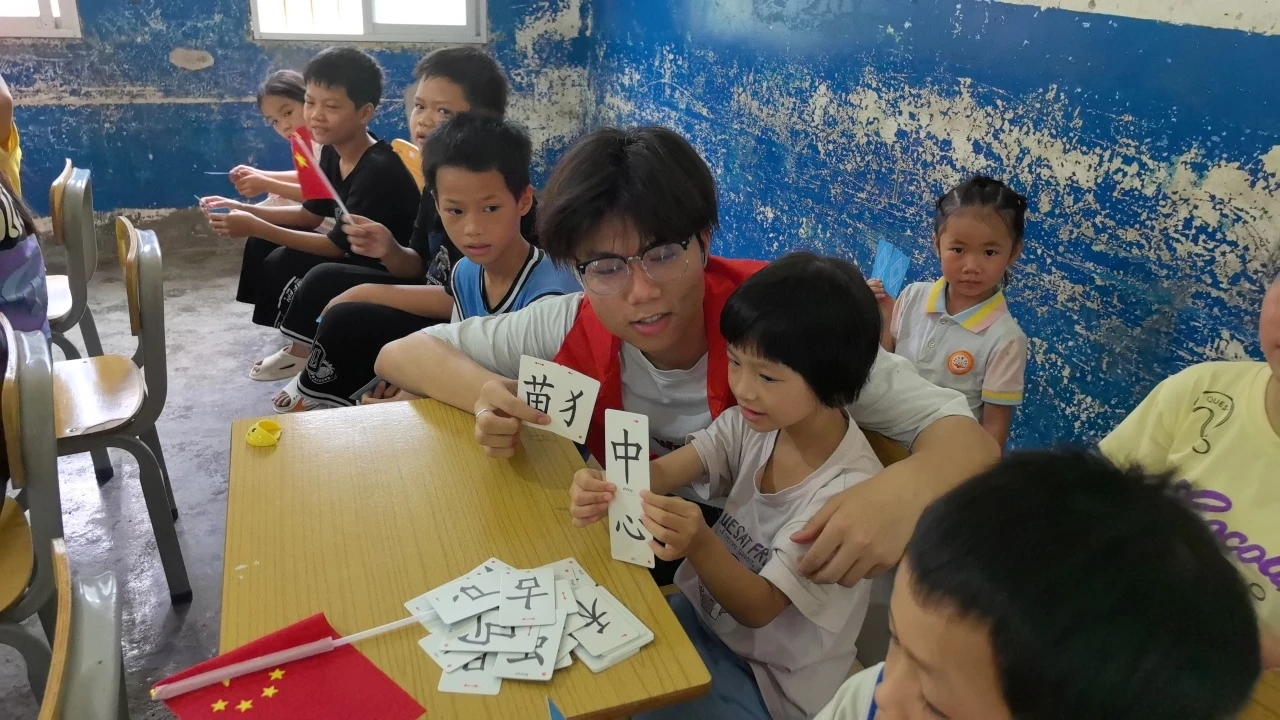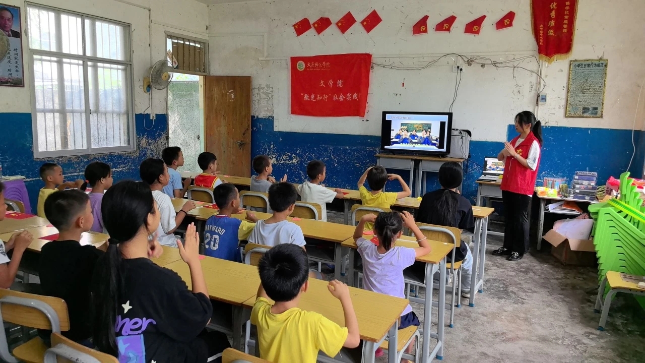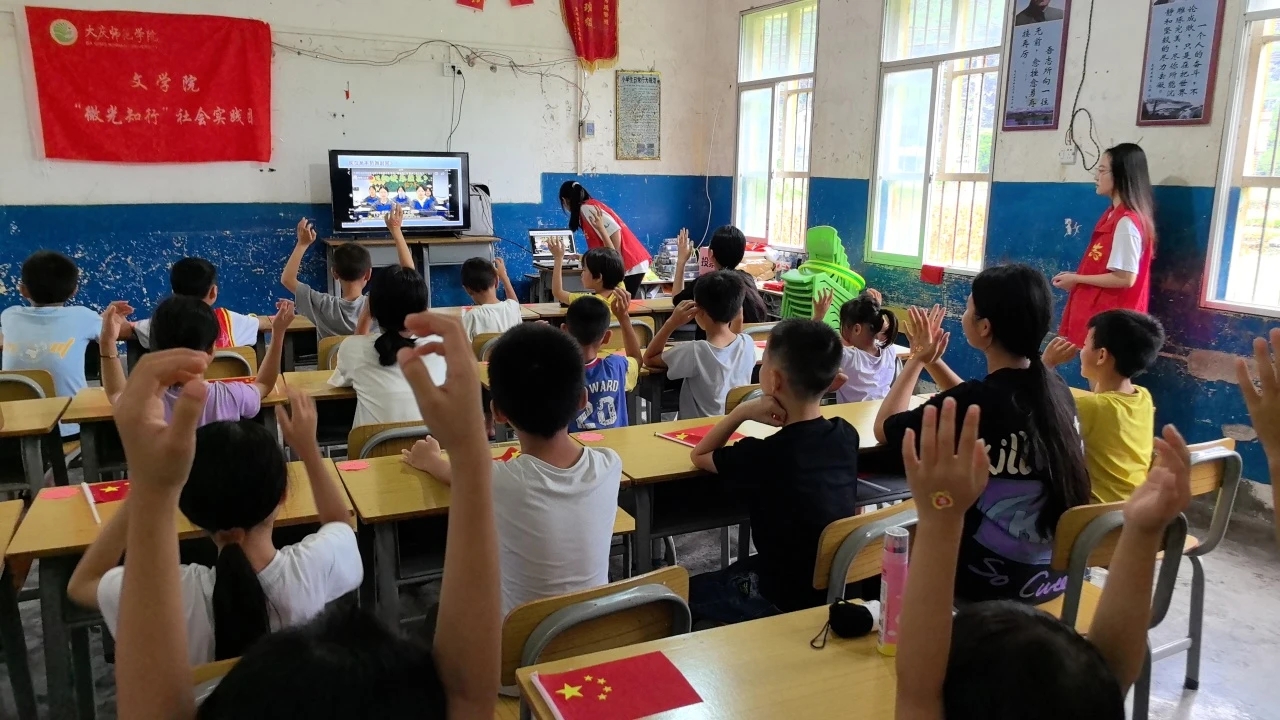 在广西,在金竹村村委会的大力支持,实践团队利用前期整合的黑龙江大庆红色文化资源精华,发挥东北高校员工普通话教育优势,面向广西乡村少数民族低龄儿童,以兴趣启发为导向、以黑龙江大庆地域性红色文化为切入点,结合前期红色推普微视频和现有数字文化资源、数字红色文化资源,向广西小员工以图文、影像、趣味性活动等丰富形式,带领广西少数民族地区儿童“游览”大庆红色文化资源基地,让广西小员工认识黑龙江大庆特有的地域性红色文化,在过程中自然融入语言文字规范化知识点,以宣传红色文化和推广国家通用语言文字为依托,弘扬中华优秀文化、繁荣乡村文化发展。