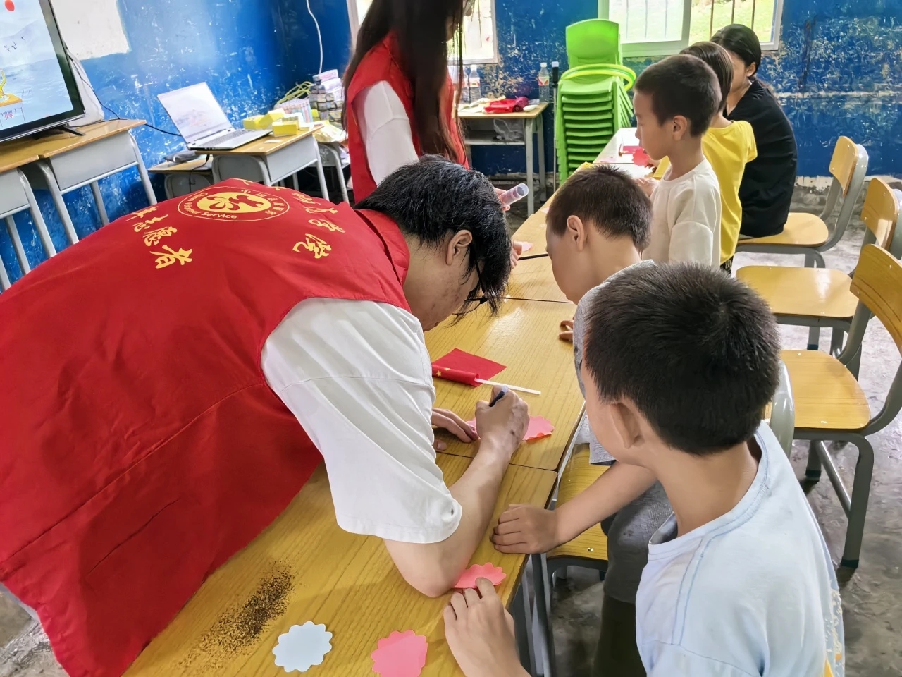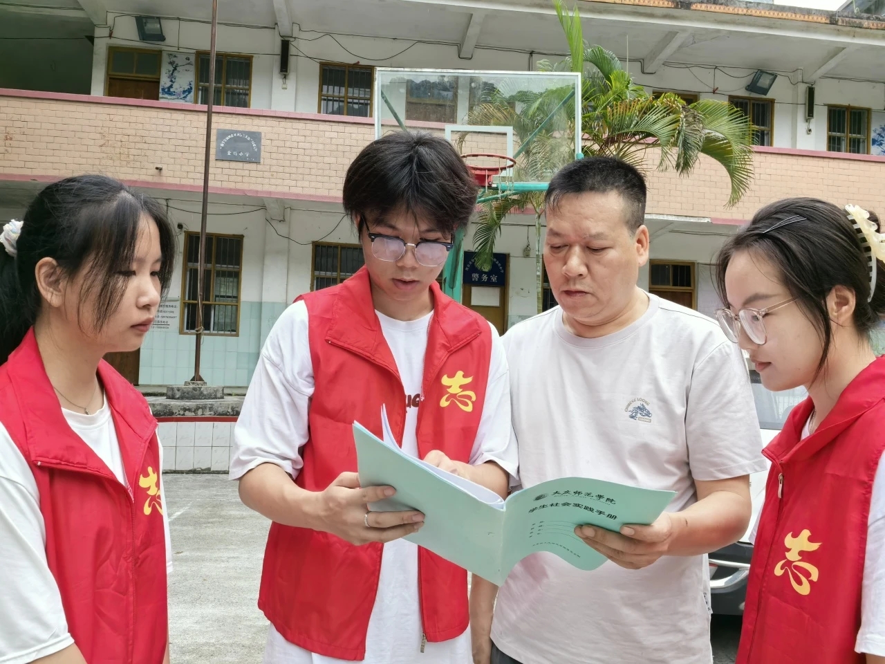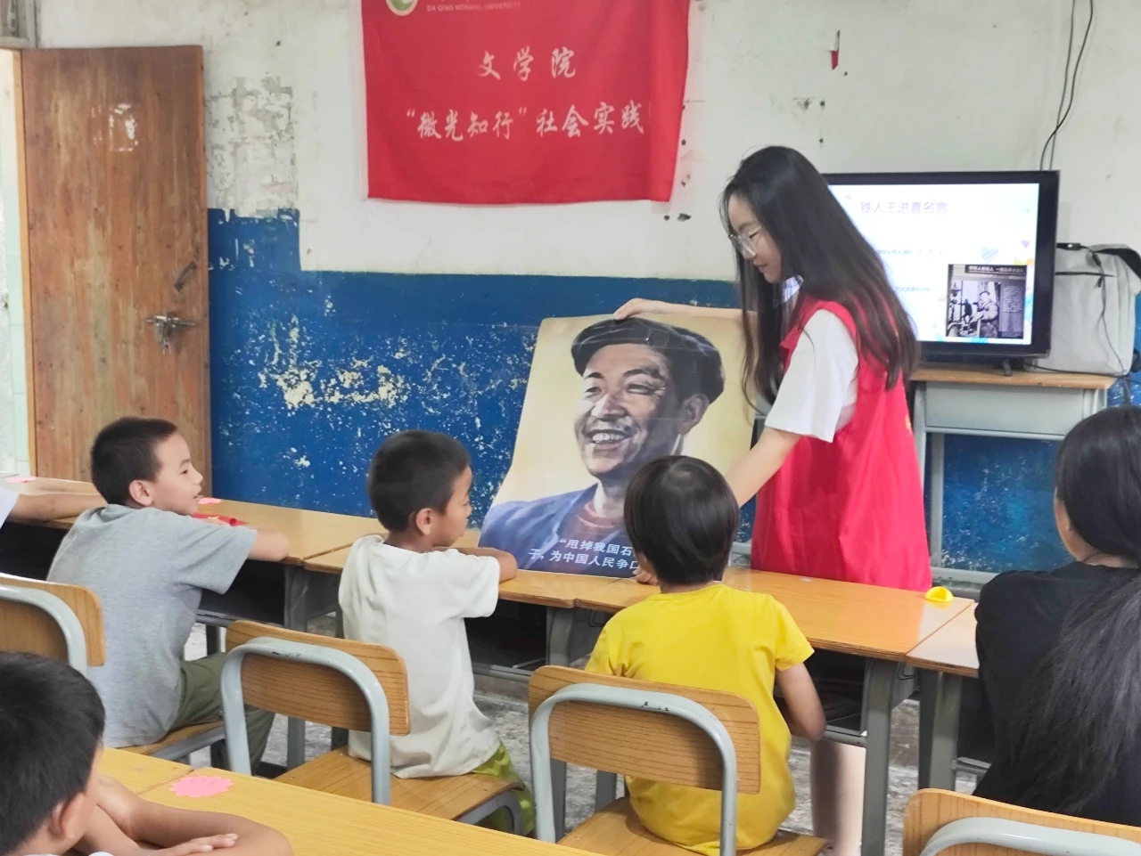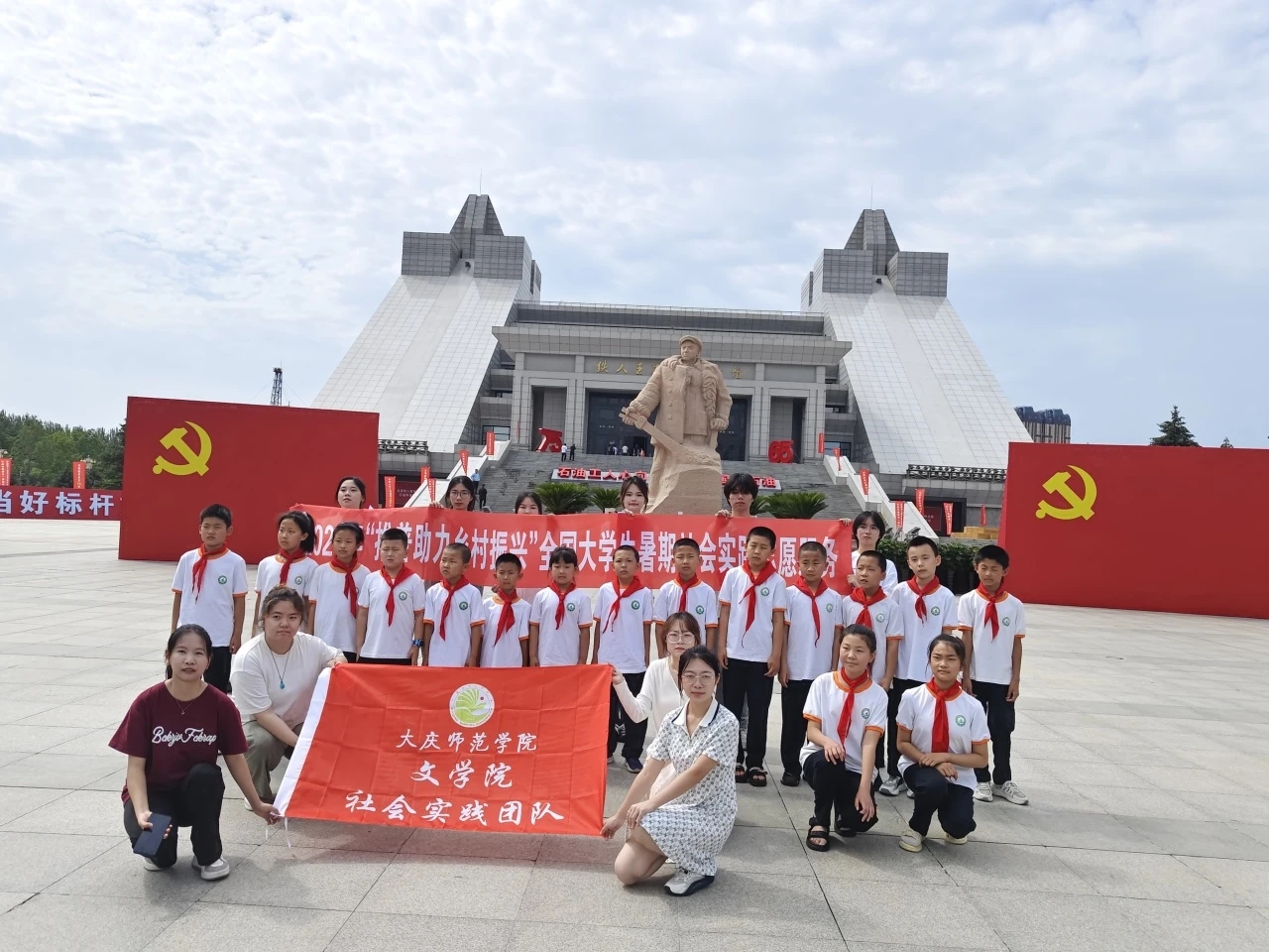 在广西,在金竹村村委会的大力支持,实践团队利用前期整合的黑龙江大庆红色文化资源精华,发挥东北高校员工普通话教育优势,面向广西乡村少数民族低龄儿童,以兴趣启发为导向、以黑龙江大庆地域性红色文化为切入点,结合前期红色推普微视频和现有数字文化资源、数字红色文化资源,向广西小员工以图文、影像、趣味性活动等丰富形式,带领广西少数民族地区儿童“游览”大庆红色文化资源基地,让广西小员工认识黑龙江大庆特有的地域性红色文化,在过程中自然融入语言文字规范化知识点,以宣传红色文化和推广国家通用语言文字为依托,弘扬中华优秀文化、繁荣乡村文化发展。