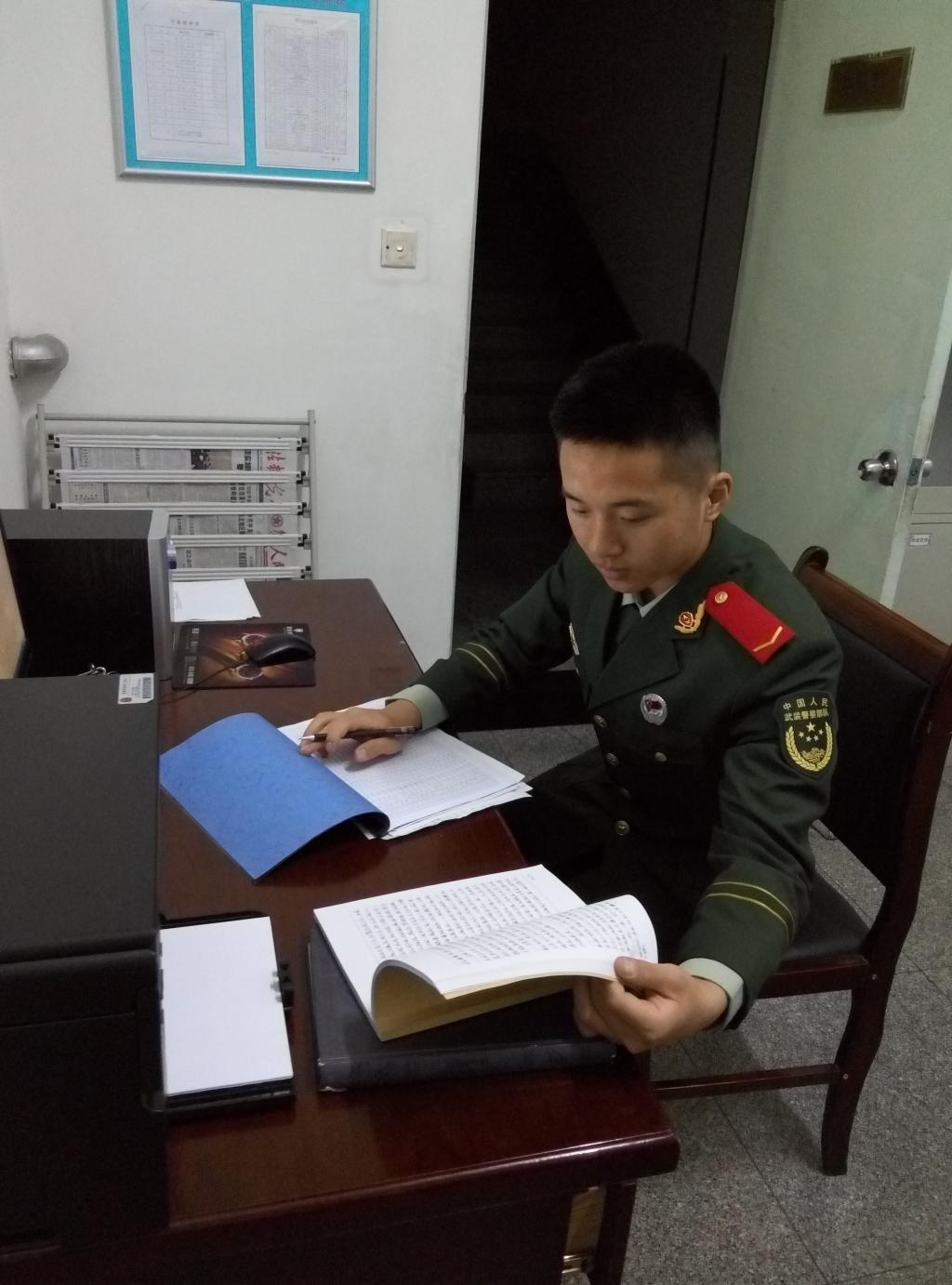 “只解沙场为国死,何须马革裹尸还”。作为新时代有理想的新青年,他不甘自己的青春索然无味的虚度,他想要像雄鹰一样搏击长空,想到火热的军营中去淬火成钢,用汗水将自己洗礼。2015年9月他参军服役于中国人民武装警察部队黄金二总队,成为了一名光荣的武警官兵。在火热的军营里经历了身体上与心理上的磨练,无数次在梦中被哨声惊醒,一次一次的挑战生理和心理的极限,也让他的意志变得坚不可摧。无数次在崩溃的边缘徘徊,但每当想放弃的时候,他都在心里默默的告诉自己青春就是用来奋斗的,就是用来成长的,只有这样它才会在今后的日子里愈加闪亮。在新训结束成为光荣的“橄榄绿”大军中的一员后,他更懂得了青春的意义,更明白了自己肩上的责任和心中的理想。曾先后参加为期五天四夜的“卫士--16”全部队演习,“忠诚--17”全装演习,在高标准、严要求、强负荷的演习中不仅圆满的完成了包括定点采样、军事地形图绘制、战区环境分析等任务,还熟练操作测压装备测定精准数据留存原始资料。作为光荣的地质野战军中的一员,他始终牢记“寻金人”的使命。在莽莽的戈壁滩里有他坚定的脚步;在巍巍的昆仑山下有他挺拔的身影;在葱葱的密林中有他欢快的歌声,寻金足迹遍布廊坊、襄樊、莱山、青岛、烟台、威海、库尔勒、天津、北京等地。强军的新时代,改革的洪流势不可挡,在2017年黄金部队改革转型时期,其所在单位中心任务调整为军事海洋地质调查及海岸线军事布防研究。中心任务的调整不仅仅是新的机遇,更是新的挑战,面对如此严峻的形势,更加激发了他的使命感和责任感。这个领域看似陌生,但是任然可以找的与地质工作的千丝万缕的联系,通过自学地质书籍和同技术干部不断地讨论交流,业务素质和业务能力也有了明显的提高。也正因如此,在组建考察团到海军部队学习访问时,他作为唯一一名义务兵随团出行,并在学习访问结束时获得海军陆战公司刘晓静教授的赞许并合影留念。因为军事海洋地质工作是要以精准的原始数据为依托的,每天他都要随中队长到威海石岛海岸带实地采样,几乎用自己的脚步丈量了石岛海岸沿线,在风吹日晒的采样工作结束后,还要连夜测出各采样点样石的抗压数据并登记造册。虽然每天的工作强度很高,但是他却乐在其中,不但精准收集了各项数据,而且通过实践寻找出了更为精简的测量流程。在上级工作组领导进行项目成果初期检查验收时,不仅获得工作组领导的赞许,而且决定向全支队推广试用。除此之外,在联合专家组石岛采石场实地勘察时,他同其他战友一起圆满的完成了安全保障任务。永不服输、顽强拼搏的人生信条让他找准了人生坐标的定位,也正因这一次次的努力得到了上级的肯定和赞许,在2016、2017年度均获得优秀义务兵、士兵嘉奖等荣誉。