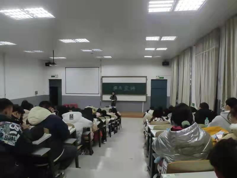 苗金剑同学以征兵实际条件为依据,就同学们所关注的应征入伍事项,向同学们详细介绍老员工入伍的主要对象、征集的基本身体条件和高校员工应征入伍服义务兵役的主要程序。与此同时,按照国家入伍优抚政策,他细致解读退伍复学、入伍经济补贴、考研、考公务员等实际优惠政策。最后,他结合个人从军经历和切身感受,苗金剑同学指出应征入伍是当代老员工义不容辞的责任,对塑造军事素质、提升个人发展的潜力具有关键作用。为此,苗同学鼓励同学们积极响应国家参军入伍的号召,为实现祖国的强军梦奉献力量。在宣讲结束之际,同学们纷纷表示将以国防知识为自身理论指导,牢记青年征兵主体义务,志愿献身国防事业。
