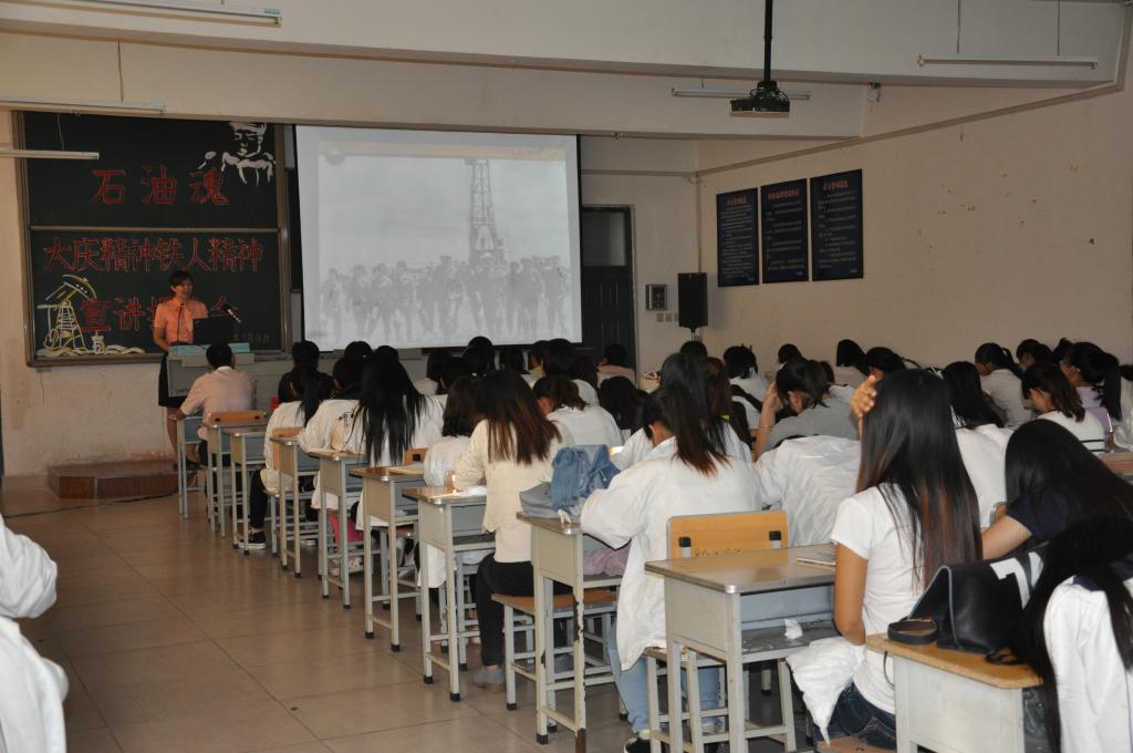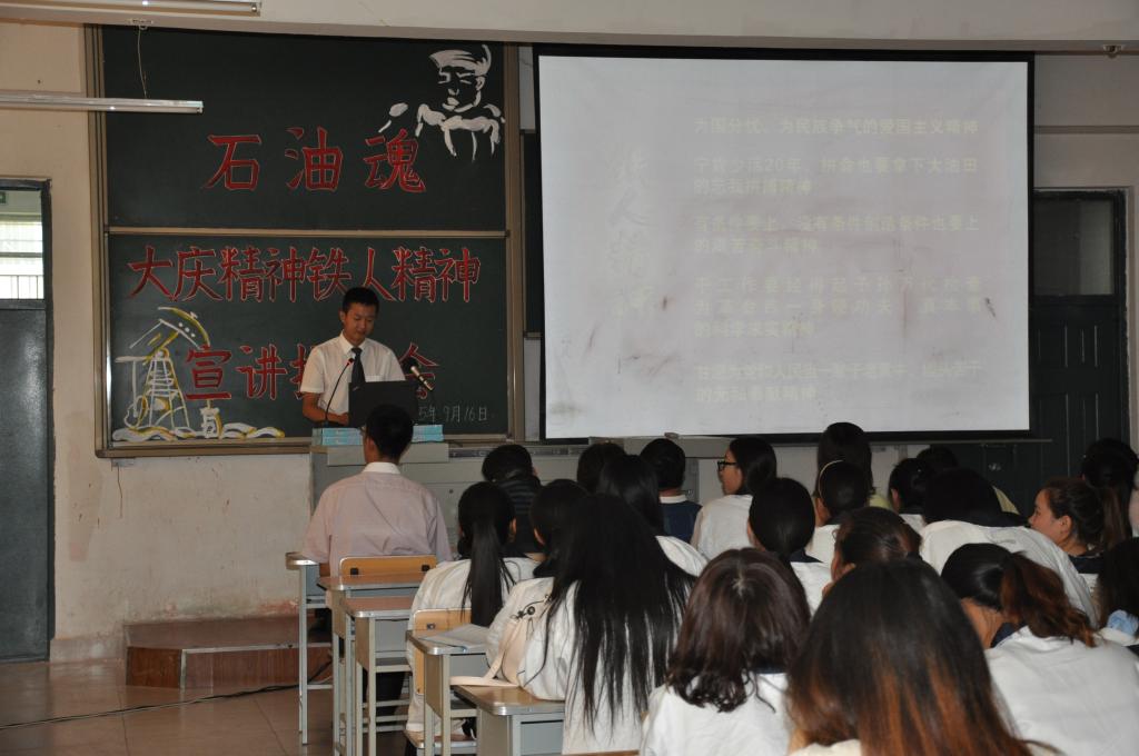 大庆精神、铁人精神宣讲团的王颖和王立志同志,分别就石油会战的历史由来、大庆的优良传统、大庆精神铁人精神、铁人王进喜的英雄事迹向与会的广大师生作了详细而生动的讲解,图文并茂地向广大师生展现了大庆油田创业之初,广大石油人不屈不挠、勇于创新、忠于革命事业的博大胸怀。两名同志富于情感、图文并茂的讲解,让大庆精神、铁人精神的神圣性充分地彰显,信仰的力量感染了与会的每一名听众。教师们感受到的是为油田、为城市培养人才的责任,广大的同学们则更加注意将大庆精神、铁人精神转化到学习实践当中,让其升华为推进实践的力量。