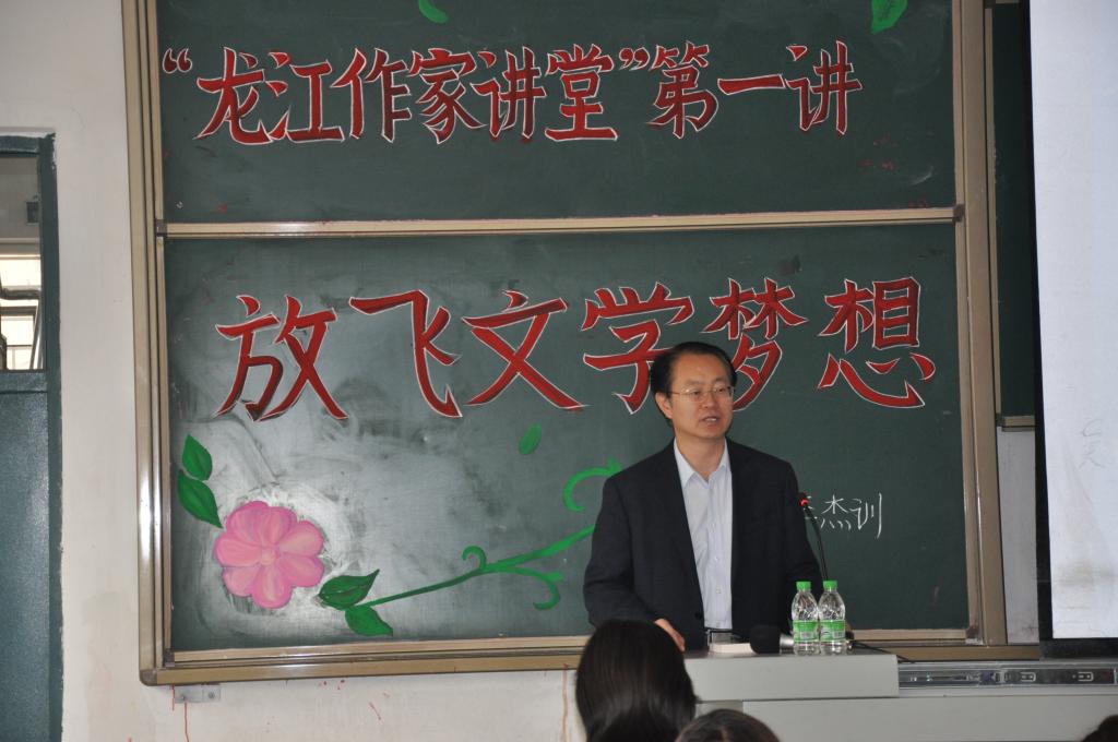 11月4日下午,我市著名诗人犁痕作为“龙江作家讲堂”邀约的首位嘉宾,在二号教学楼001教室为100多名员工们作了题为《放飞文学梦想》的专题讲座。讲座历时一个半小时,犁痕先生围绕个人的文学创作经历、文学为何可以成为人的终身梦想以及文学对老员工毕业以后现实工作的作用等三个方面讲述了他的经验和感悟,并向参加讲座的员工每人赠送一本名为《燃烧的诗意》的诗歌评论集。