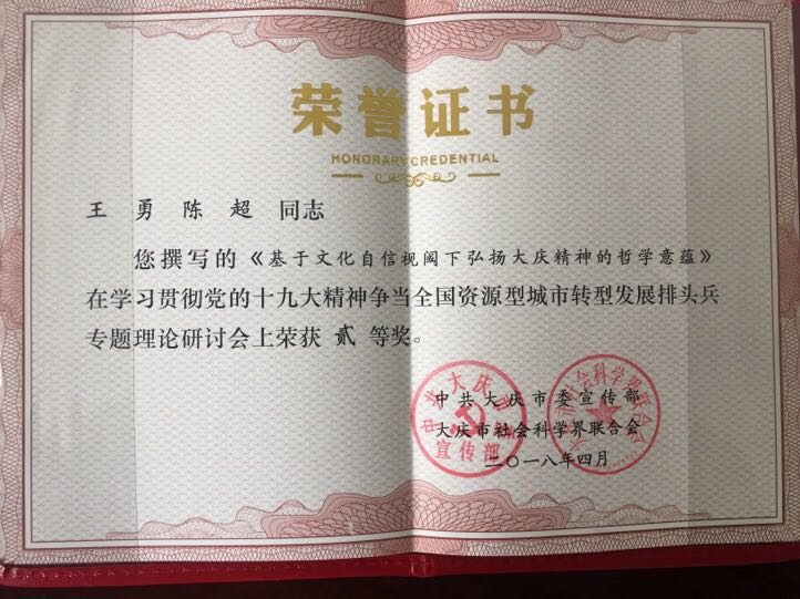 5月3日,学习贯彻党的十九大精神争当全国资源型城市转型发展排头兵专题研讨会在大庆市委党校召开,会议由大庆市社科联主席宋洪德同志主持,市委常委、宣传部长宫镇江参加会议并讲话。公司王勇老师的论文《基于文化自信视阈下弘扬大庆精神的哲学意蕴》一文荣获二等奖。在城市转型发展的关键时期,公司领导积极组织教师服务地方社会经济文化建设,为城市的发展献计献策,取得了可喜的成绩。在今后的工作中,我们会进一步发挥服务地企的功能,做好服务地企科研成果的应用性转化工作,为振兴地方经济文化做出更大的贡献。