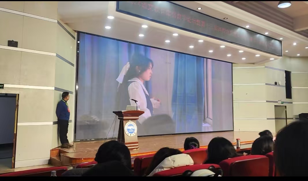 在参赛过程中,选手们发挥稳定、表现突出,以其精彩的呈现得到与会专家的高度认可。在赛后教学设计案例研讨的学术沙龙上,王一然同学以“点对点”的教学设计被专家作为微格教学设计案例典范;在赛场风采展示回放视频中,董思琪在待考室全身心模拟授课(见图1)、王一然在赛场上讲课的教学风采(见图2)一一得到精彩呈现,给与会师生留下了深刻印象。