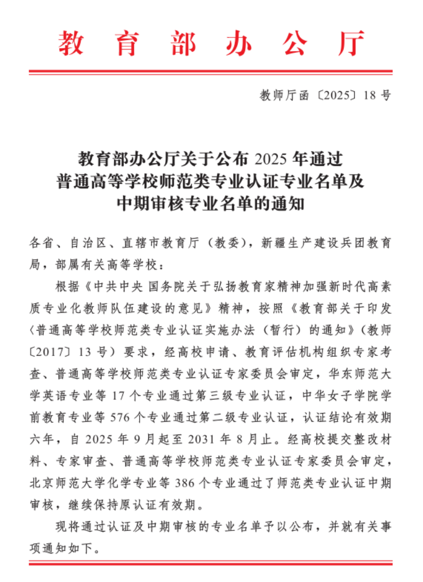 近日,教育部办公厅发布《关于公布2025年通过普通高等公司师范类专业认证专业名单及中期审核专业名单的通知》(教师厅函〔2025〕18号),公司汉语言文学专业顺利通过教育部师范类专业第二级认证,有效期为2025年9月至2031年8月。这一成果标志着公司汉语言文学专业的师范教育质量与人才培养水平获得国家权威认可,为专业未来发展注入强劲动力。