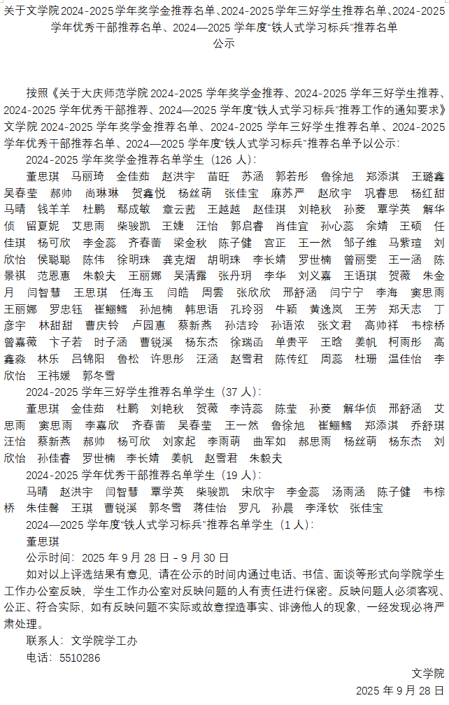 关于伟德国际19462024-2025学年奖学金推荐名单、2024-2025学年三好员工推荐名单、2024-2025学年优秀干部推荐名单、2024—2025学年度“铁人式学习标兵”推荐名单公示